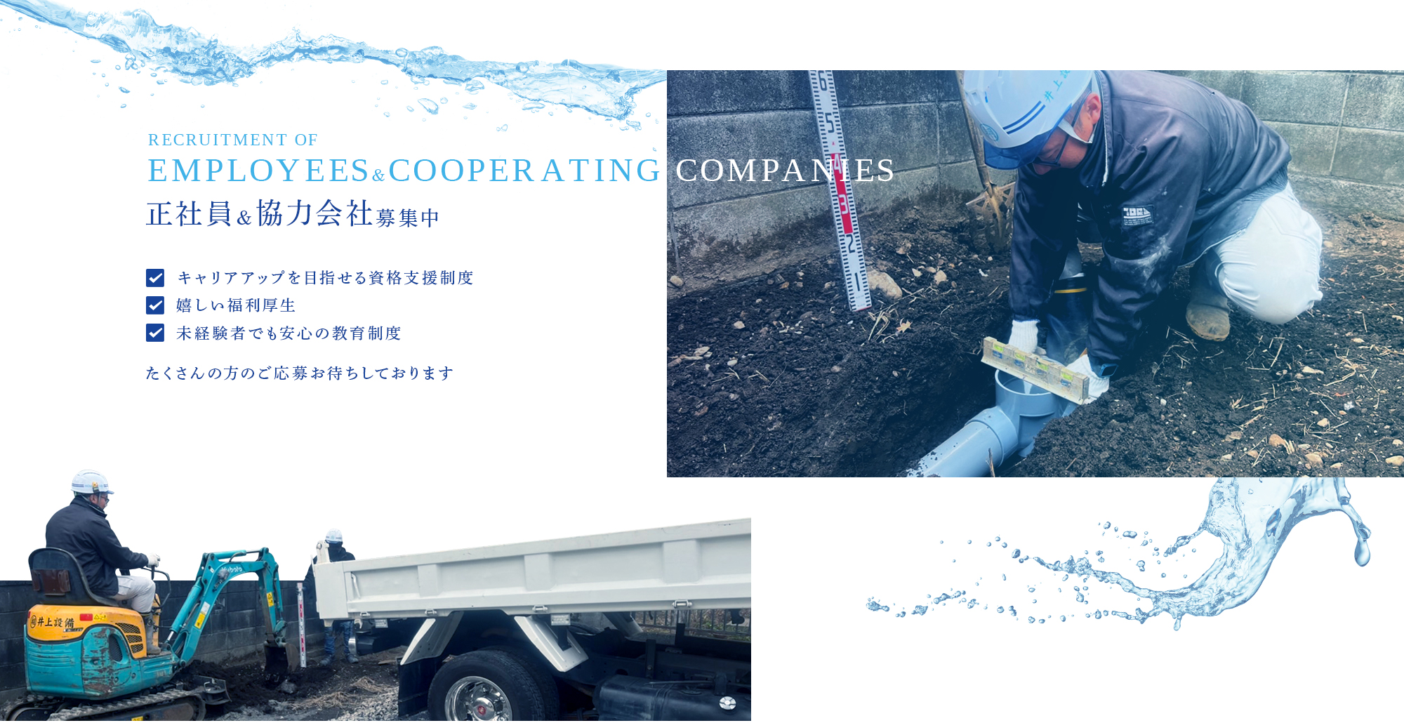 また、協力会社様の募集も行っておりますので配管工事、水道工事の仕事を行っている一人親方や事業主様がおられましたらお気軽にお問い合わせ下さい。